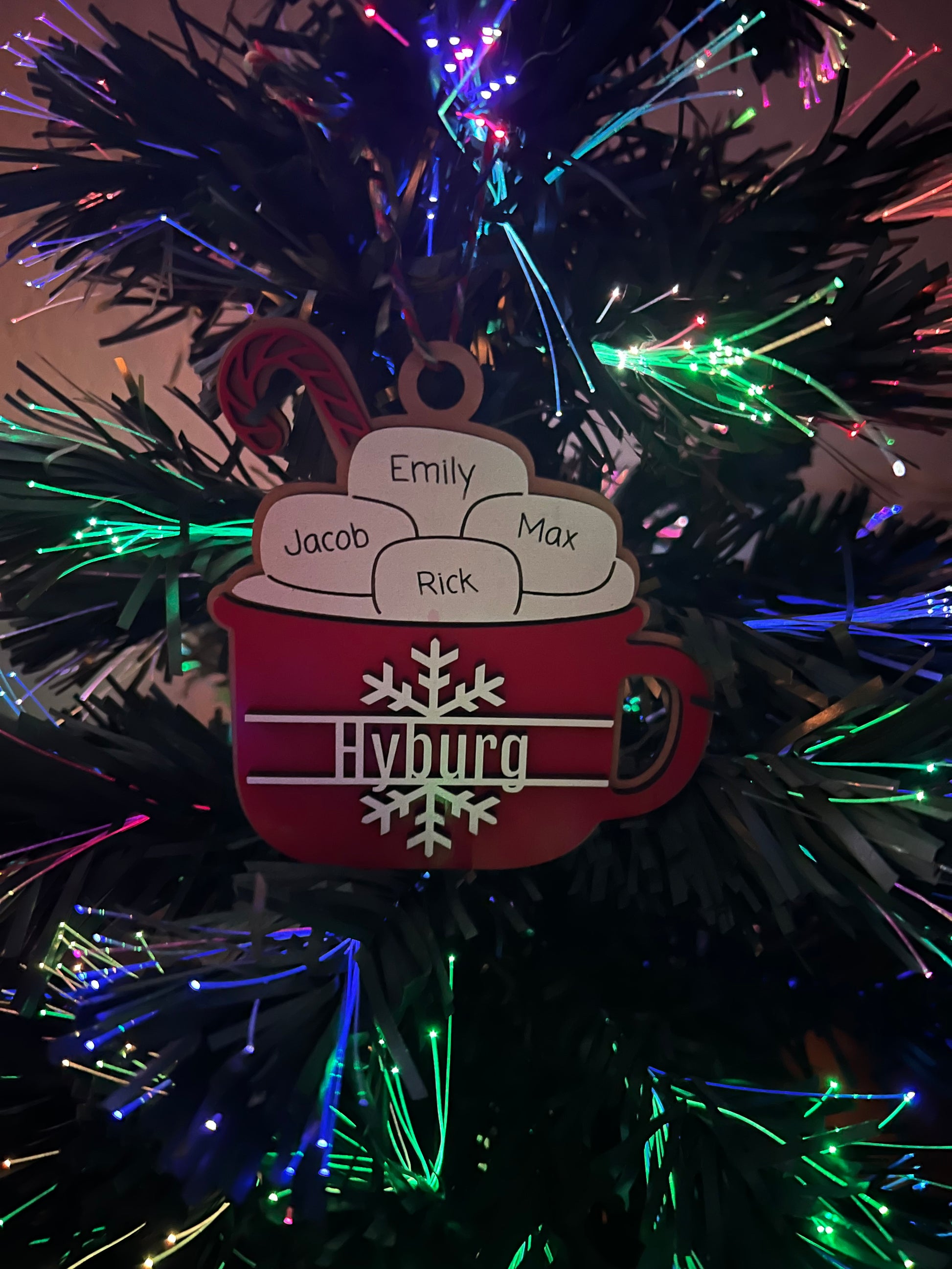 Indulge in the warmth and coziness of our personalized hot cocoa ornament. Made with high-quality wood material and customizable with up to eleven names, this makes for a unique and heartwarming Christmas gift. Order now and avoid the holiday rush - allow 3 days for processing.